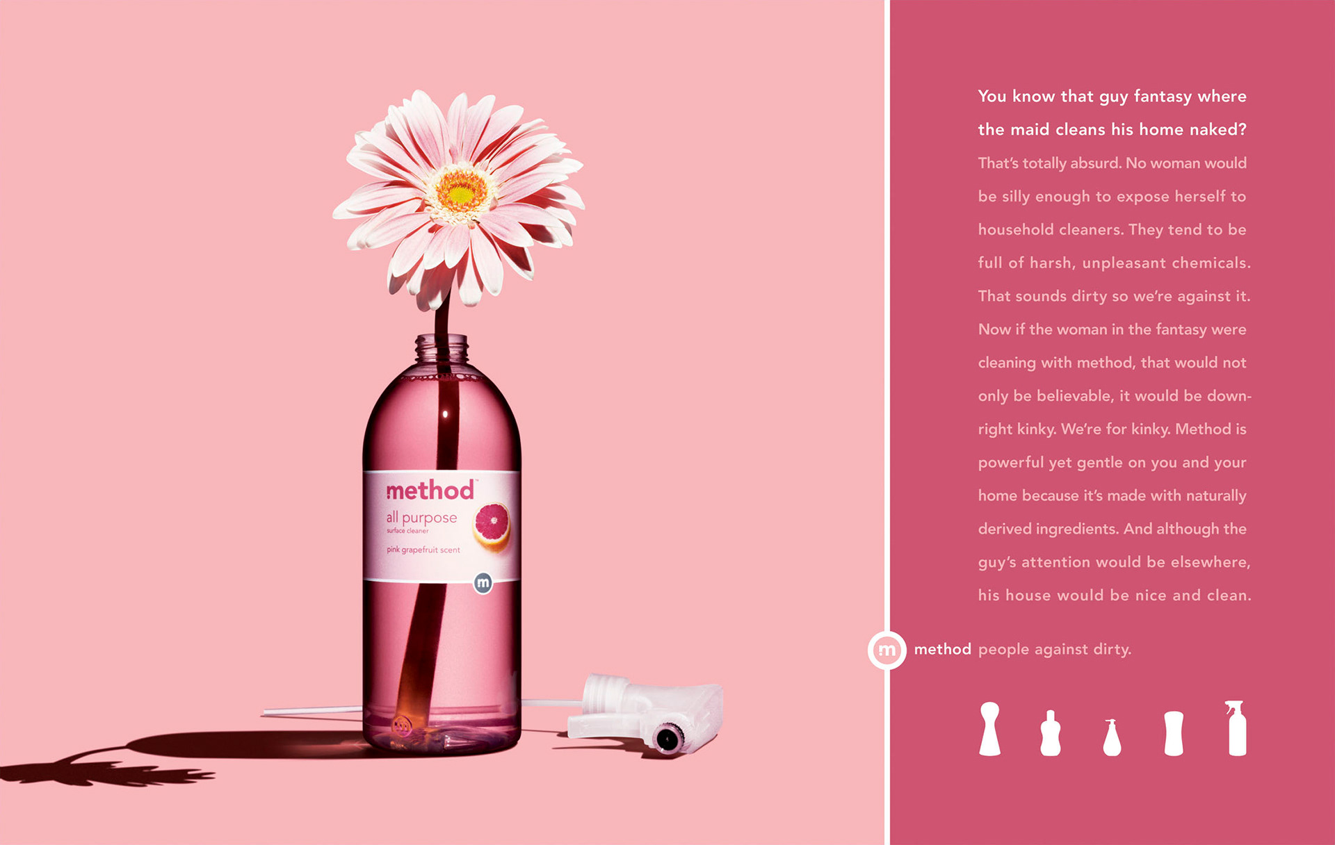In 2003, we were charged with launching Method to the world. As an Art Director working on this project, I randomly placed some flowers in bottles and left them overnight. When we returned the next morning, to our surprise, not only had the flowers lived, but they actually looked healthy. This was the inspiration for the following campaign, which ultimately spoke to the natural efficacy of the product itself. On a separate note, apparently I wrote the tagline "People against dirty." My partner Franklin Tipton and I were tossing out ideas and upon returning from the client presentation, he congratulated me on the line they had chosen. I believe my response was, "what line?... I wrote that?? Cool."